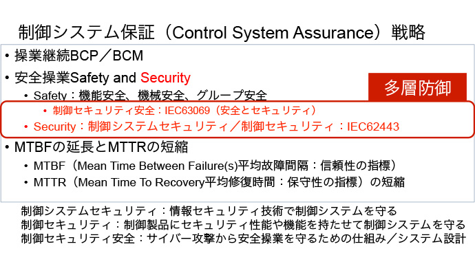 制御保証戦略では、事業継続計画BCP及び管理BCMの導入により、ゾーン設計の考え方が変わったり、冗長化システムのDCSへの要求仕様も変ってきたりしております。また、機能安全やグループ安全、機械安全などの安全をサイバー攻撃があってもリスクアセスメントを確保するためにセキュリティ対策の考え方も導入することが求められるようになっています。当然、MTBFの延長やMTTRの短縮をサイバーセキュリティ対策含め、対策していく必要があります。